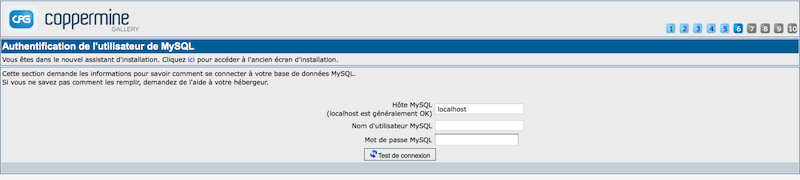 | Your MySQL configuration (votre configuration MySQL) | MySQL est le type de service de base de données disponible sur la plupart des serveurs web. Si vous ne l'avez pas, vous ne pouvez pas l'installer vous-même. Si vous avez un hébergement web, vous êtes probablement malchanceux. Il est obligatoire d'avoir une base de données MySQL pour utiliser Coppermine ou beaucoup d'autres scripts PHP. Vous ne pouvez pas truquer les informations MySQL pendant l'installation, vous devez les connaître avant, et entrer les informations comme demandé. Si vous n'êtes pas sur des informations requises, demandez votre hébergeur. |